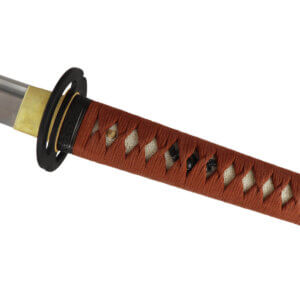 Daran orientiert sich das Design dieses Schwertes mit roter Schwertscheide und der bekannten Namako Doppelring-Tsuba, die auch als Musashi Tsuba bekannt ist.