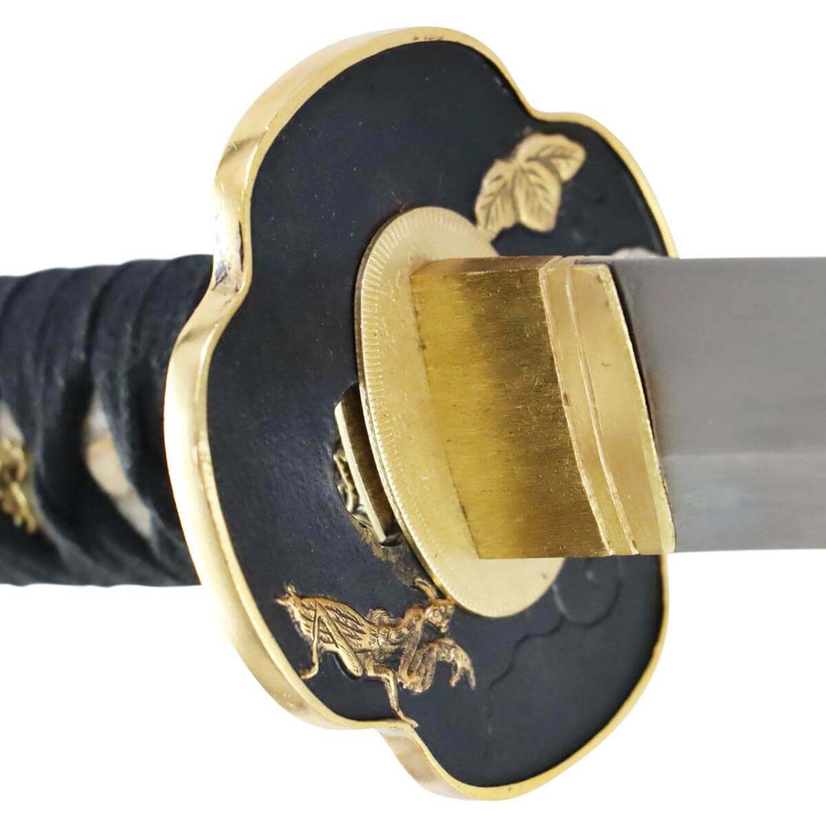 Kamakiri-Motiv (Gottesanbeterin), mit antiker Optik. Goldfarbene Fukurin Nachbildung (Nachbildung einer massiven Einfassung des Stichblattes). Das Stichblatt ist in Mokko-Form.